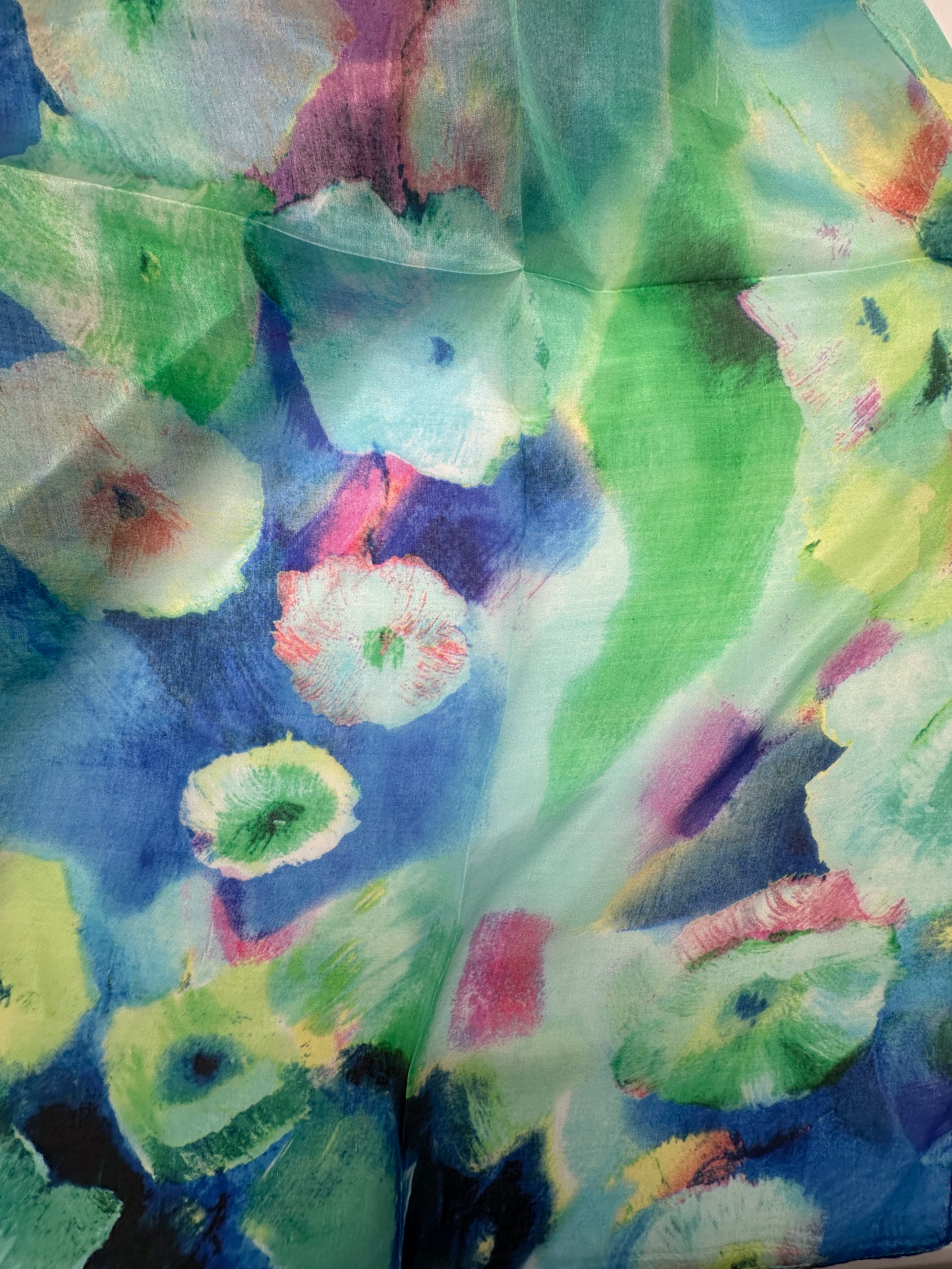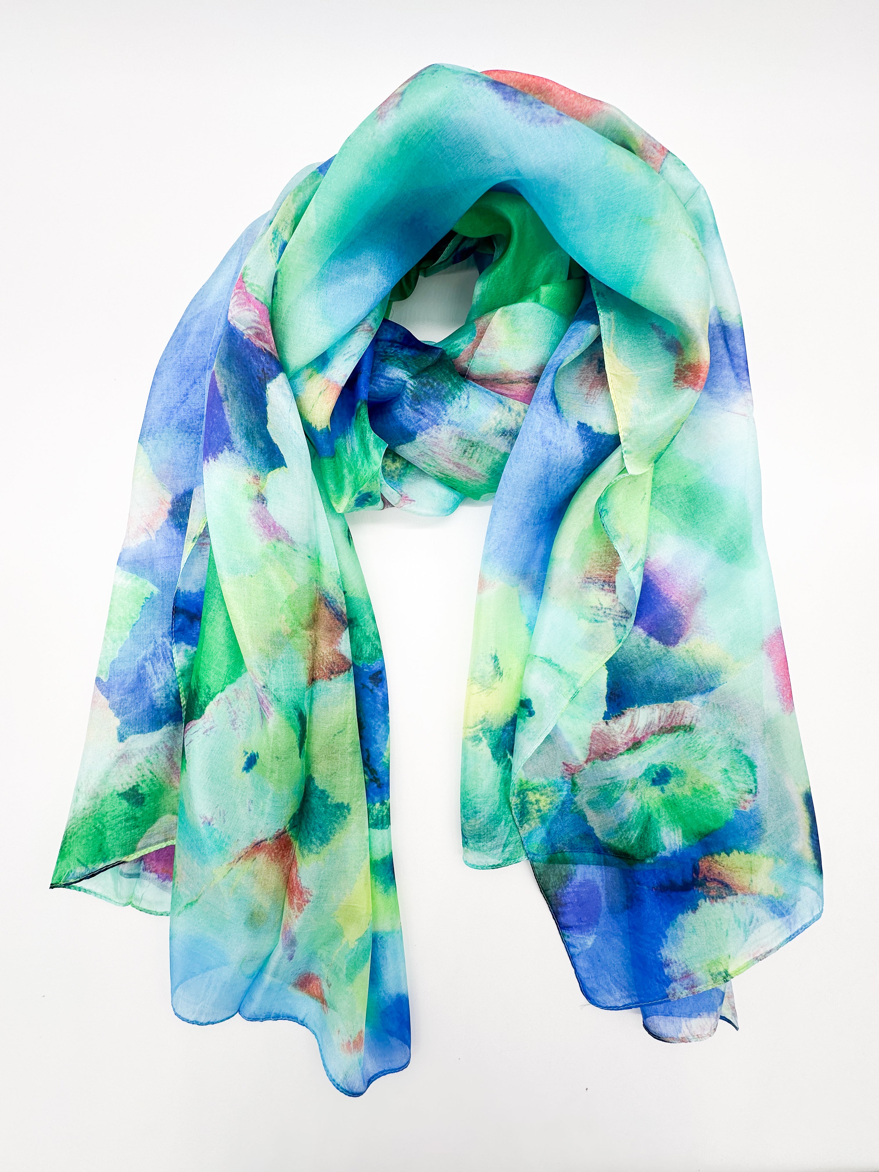 A natural silk chiffon scarf is perfect for wearing with a dress, top, as well as a spring coat or other light outerwear! This scarf is airy, transparent, and light with a beautiful fabric drape.