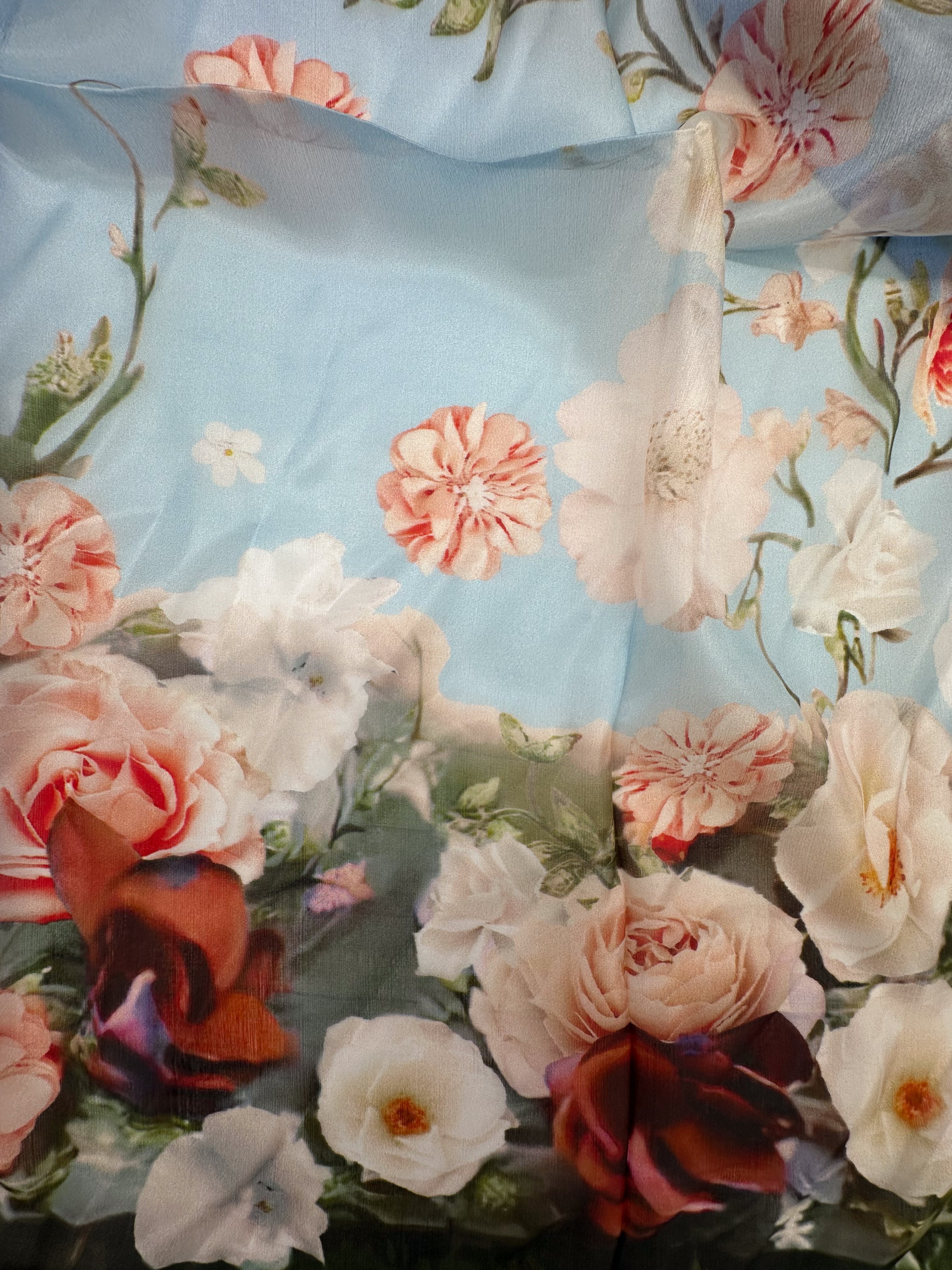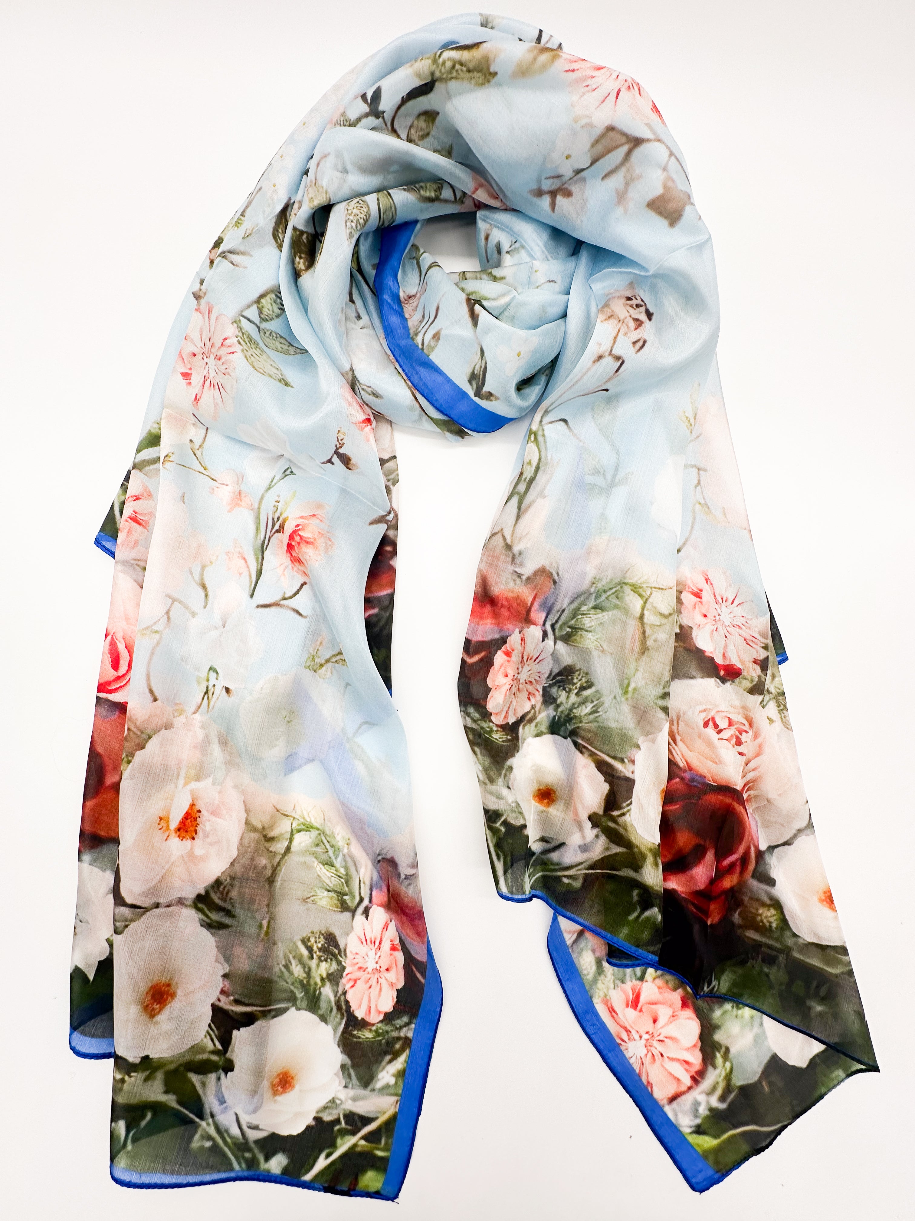 A natural silk chiffon scarf is perfect for wearing with a dress, top, as well as a spring coat or other light outerwear! This scarf is airy, transparent, and light with a beautiful fabric drape.