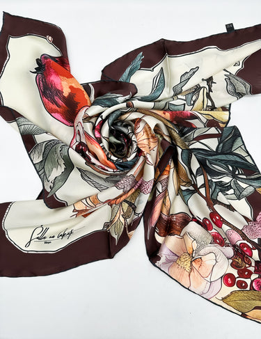 Dabīgā zīda satīna lakats 107x107 cm - šim zīda lakatam raksturīgs skaists spīdums un bagātīgs auduma kritums, ar roku apstrādāta maliņa. Šis lakats ir ekskluzīvs produkts un predzēts delikātai vaklāšanai, piemērots mazgāšanai tikai ar rokām vai ķīmiskajā tīrītavā!