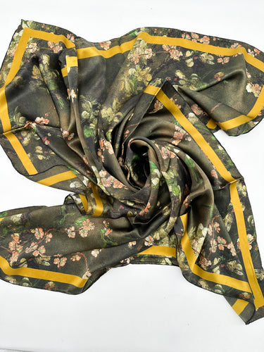 Dabīgā zīda satīna lakats, šim zīda lakatam raksturīgs skaists spīdums un bagātīgs auduma kritums, ar roku apstrādāta maliņa. Šis lakats ir ekskluzīvs produkts un predzēts delikātai vaklāšanai, piemērots mazgāšanai tikai ar rokām vai ķīmiskajā tīrītavā!