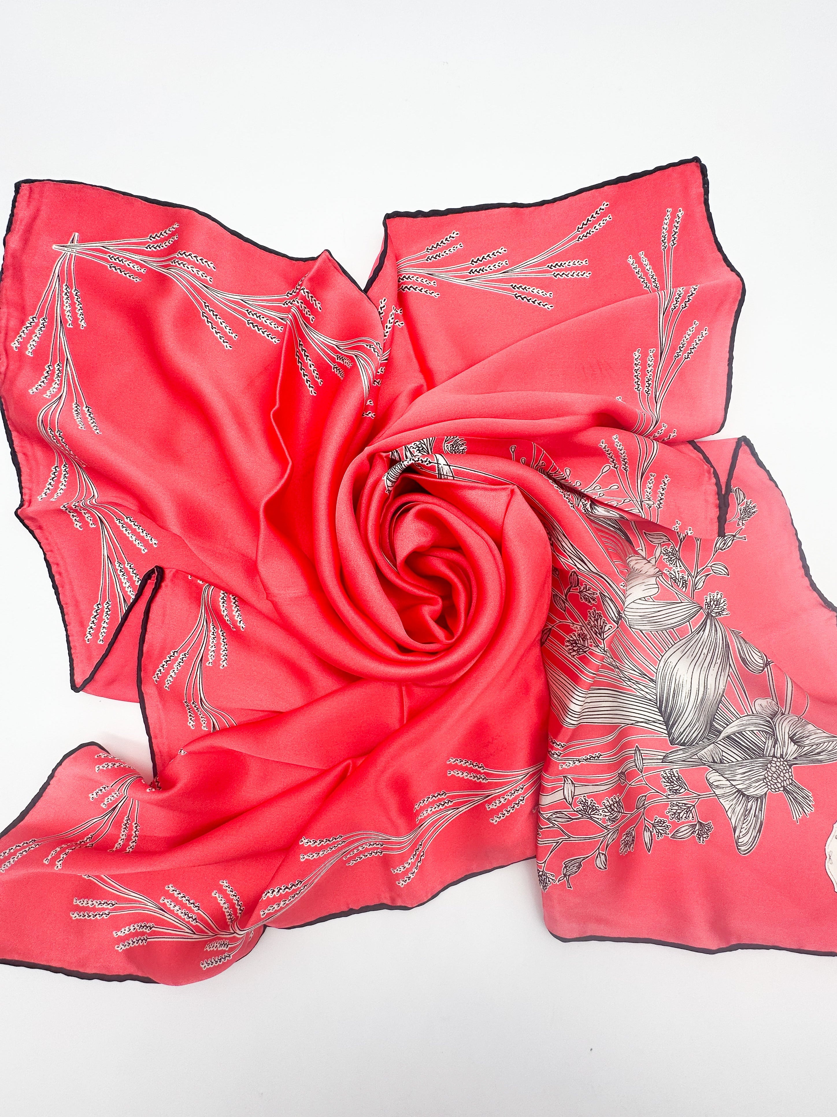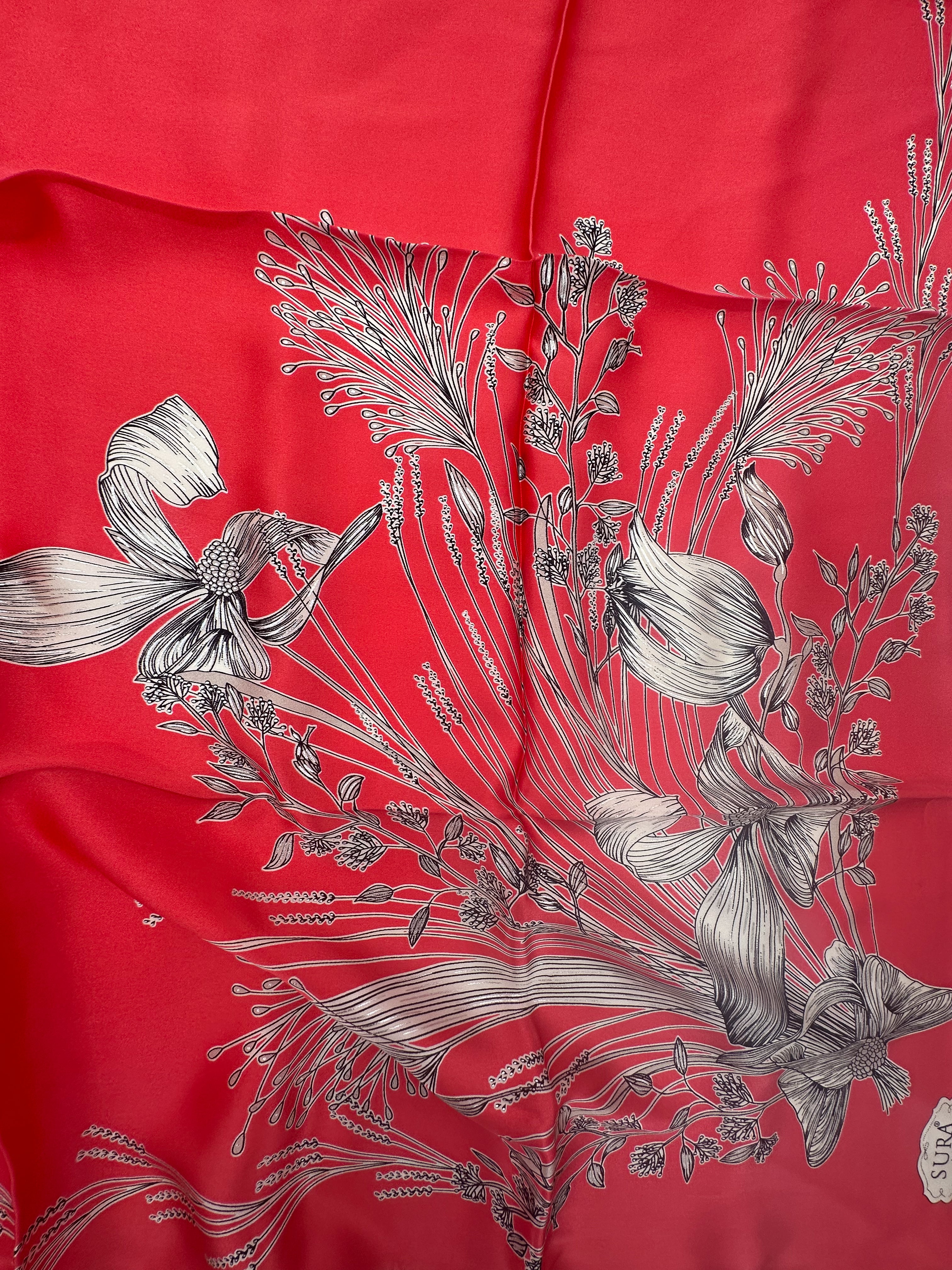 Dabīgā zīda satīna lakats 90x90 cm - šim zīda lakatam raksturīga koša un izteiksmīga krāsa. Šis lakats ir ekskluzīvs produkts un predzēts delikātai vaklāšanai, piemērots mazgāšanai tikai ar rokām vai ķīmiskajā tīrītavā!